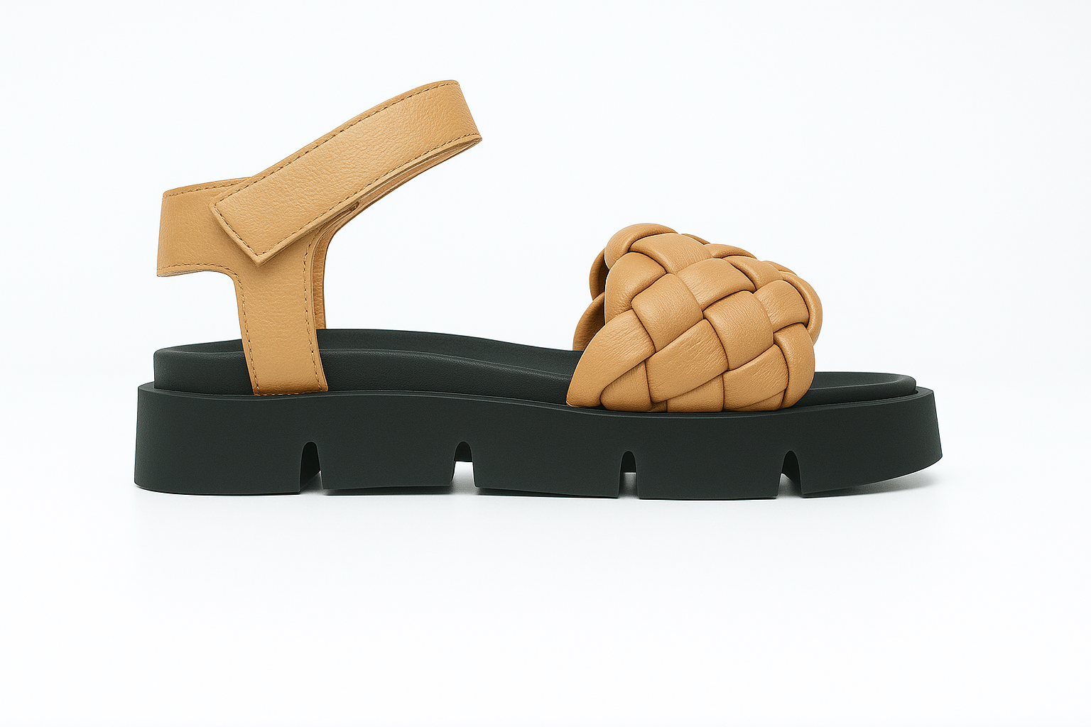 Sandalia de tiras trenzadas elaborada en cuero sintético color miel, con plantilla acolchada para mayor comodidad. Diseño ergonómico con suela negra de goma antideslizante y ligera. Cierre tipo slingback para ajuste seguro y práctico. Ideal para uso diario gracias a su combinación de estilo, comodidad y durabilidad.